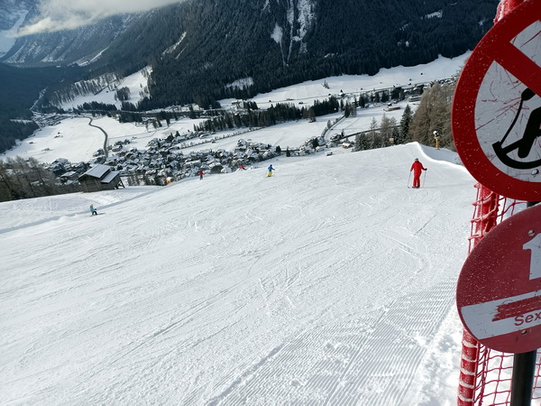 | Dal rifugio "Pendio" -Sesto Pusteria. Piste ben innevate e buona frequenza di sciatori nello scorso fine settimana. Appena sotto il passo, impianto "Orto del Toro", abbiamo visto una distesa di macchine parcheggiate anche lungo la statale, ci è sembrato il circuito più frequentato. |