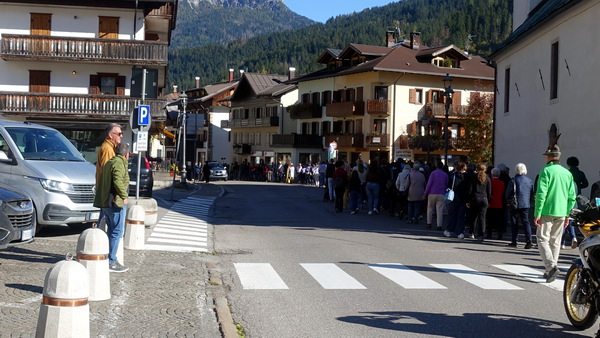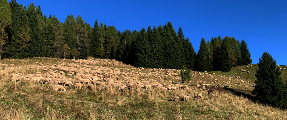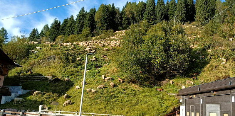 | domenica 5 ottobre 2025 Abbiamo seguito con curiosità il soggiorno di alcuni giorni del folto gregge di pecore che stazionava appena sopra il paese. Eravamo abituati a vederle così numerose lungo le strade della migrazione o sui pascoli alti della val Visdende. Sicuramente hanno fatto pulizia nei tratti di terreno che rischiano di riempirsi di cespugli. Oggi pare l'avvio verso Campolongo. |