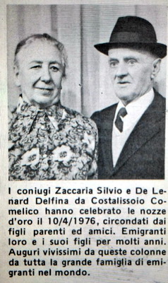 | Storie di emigrazione. Nei giorni scorsi in paese la notizia della scomparsa nel Biellese di Angela De Lenart (Sartorel). Ultima di tre sorelle figlie di Andrea di cui ricordiamo "Maria d'Mosè) mamma di Luciana De Mario, Costalissoio-S.Stefano. Partita da Costalissoio all'età di sette anni per raggiungere il padre che come tanti del paese aveva trovato lavoro in quelle valli piemontesi negli anni "Trenta". Chi era in contatto con Angela la ricorda per aver conservato sempre il dialetto di origine. Tanti i cognomi che appartengono alla nostra realtà paesana che troviamo in quei luoghi, alcuni sono rientrati ma altri sono rimasti e così troviamo nella discendenza cognomi nostrani. |
