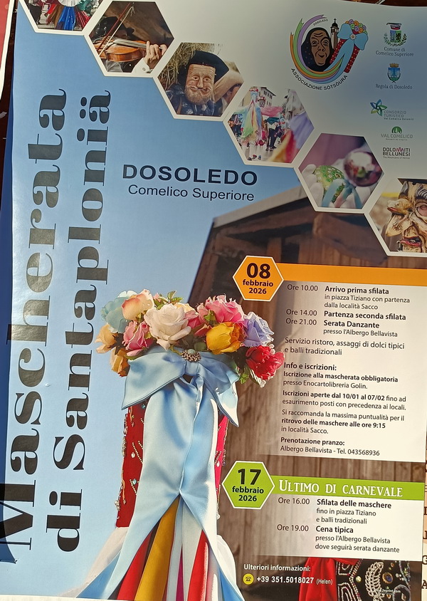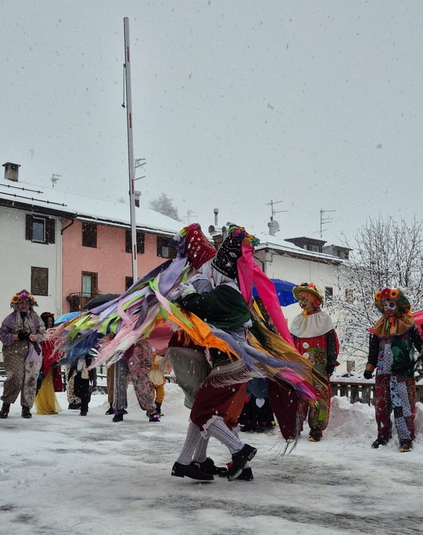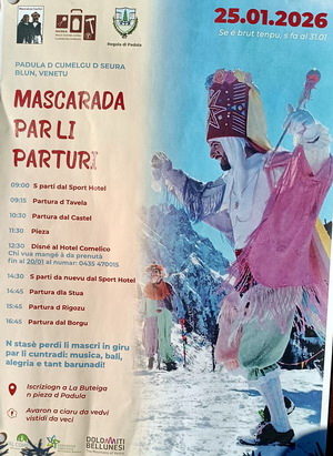 Anche il nostro Andrea Pomarè Montin nel ruolo di "Matazin" (D nella foto) alla mascherata di Padola del 25 gennaio 2026. "Prime sfilate storiche a Selva e in Comelico" così titola il "Corriere delle Alpi" del 27-1-26. Carnevale sotto la neve a Padola, le maschere tradizionali dei Matazins, interpretati da Andrea Pomarè Montin e Mattia De Candido e delle Matazere, Sofia Pomarè e Giorgia Modolo hanno percorso le contrade del paese "li parturi" con musica e ballando. Una ventata di allegria anche se la giornata meteo non era favorevole. La manifestazione ha avuto comunque pieno successo, presenti una trentina di maschere. (nei prossimi giorni dedicheremo una pagina dell'evento con foto e filmati) ![]() |