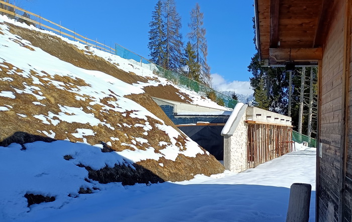 | sabato 7 febbraio 2026 Per il periodo invernale, sospesi i lavori del fabbricato al servizio dell'area "Piazzolette". Così risulta al grezzo il manufatto. |