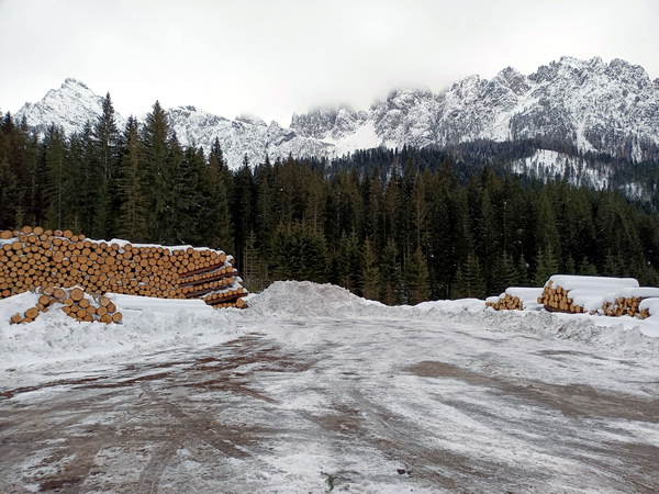 Così la Val Visdende dopo le ultime nevicate. Lavori boschivi sempre attivi.
