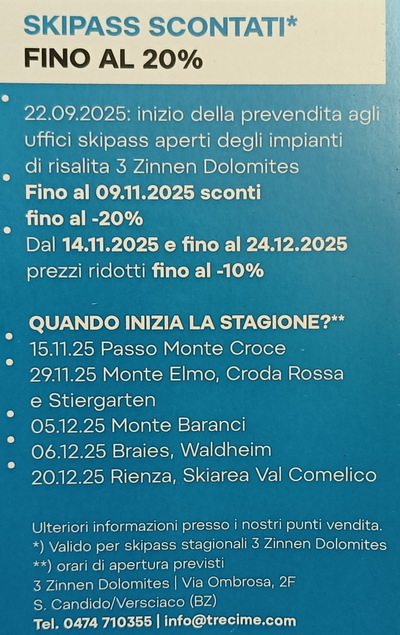 Nelle nostre case è stato recapitato il depliant della Società Tre Cime che gestisce gli impianti della vicina Pusteria compreso l'area di Padola che come si legge aprirà il 20 dicembre 2025, al Passo Monte Croce già si scia.