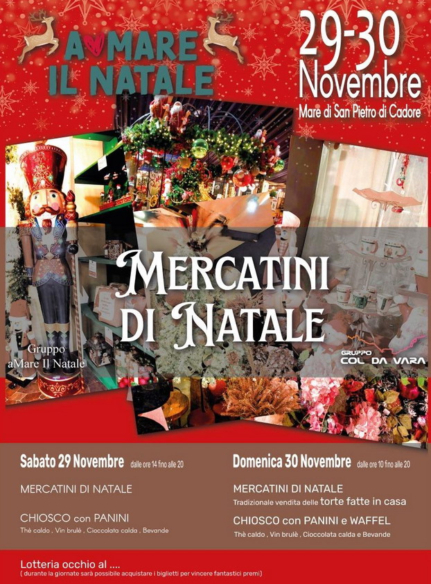 AMare il Natale, mercatini di NataleMare, San Pietro di CadoreSabato 29 Novembre dalle ore 14 fino alle 20 Apertura MERCATINI DI NATALE e CHIOSCO The caldo. Vin brule, Cioccolata calda. Bevande Domenica 30 Novembre dalle 10 alle 20: MERCATINI DI NATALE Tradizionale vendita delle torte fatte in casa CHIOSCO con WAFFEL The caldo, Vin brule, Cioccolata calda e bevande |